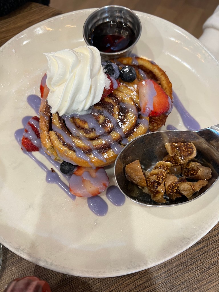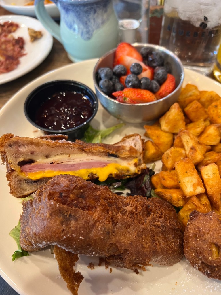 We started the day having brunch at Blueberry’s Grill on Eastwood, and their blueberry hushpuppies won my heart. We ordered the Cinnamon Roll French Toast, Chicken and Waffles, Classic Benedict, and the Monte Cristo deep fried and served with their triple berry compote on the side. It was delicious.